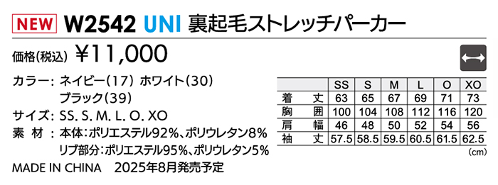 前の商品 W2542 裏起毛ストレッチパーカー 次の商品
